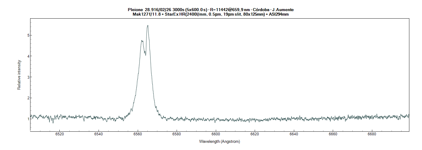 Y éstos son sus espectros centrados en Hα ya reducidos (tras las correspondientes correcciones de la distorsión atmosférica y de la respuesta instrumental):