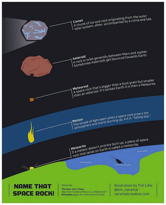 Un meteorito es el peñasco procedente del espacio que recoges del suelo. Conviene hablar con propiedad y distinguir correctamente entre asteroide, meteoroide, bólido, meteoro y meteorito.